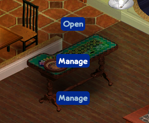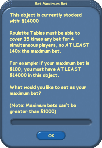 Anyone can play the slots, but only the owner can manage them. The owner is responsible for stocking the machine with enough funds to cover all potential payouts and can profit from any money that is not paid out to players. Slot Machines: Player To play the Slot Machines, click on the machine you would like to use and select the "Play" option. This will bring up a special Slot Machine control panel. Click on the Slot Machine handle graphic or the curved arrow button in the lower right corner of the control panel to set the wheels in motion. ![]() Slot Machine Play Panel When each wheel stops, it will either show a symbol or a blank on the pay line. Once all wheels have stopped, the game will compare the symbols on the pay line against the payout table and pay the listed amount. You can see a legend of the winning combinations and the corresponding payout table by clicking on the "up arrow" button on the upper left corner of the Slot Machine dialog box. To win, your pay line must match the exact sequence shown in the payout table. To raise or lower the amount of money you are putting into the machine, simply click on the up and down arrows next to the betting window. The more money you bet, the more money you can win. You can only raise or lower the bet by the Slot Machine's value. (i.e. If you are playing the §5 slots, you can only raise or lower your bet by §5.). You can bet up to 5 coins per spin, so a §5 Slot Machine would allow a maximum bet per round of §25. ![]() Winning at Slots After each round, depending on whether you win or lose, Simoleons will automatically be credited or debited from your cash on hand. Slot Machines: Owner To manage your Slot Machine, click on the machine and select the "Manage" option. This will bring up a different control panel that will allow you to do a number of things. ![]() Slot Machine Management Turn the object on or off: Click the radio button to make this Slot Machine available or unavailable or others to play. Cash In/Out: As an owner you are responsible for maintaining a minimum balance of funds in the machine to cover any potential winnings by players. Click this button to deposit money into the machine or withdraw any of the current balance into your personal bank account. Machines that do not have the minimum balance will not be available for visitors to play. Set The Odds: As the owner of a Slot Machine, you have the option of setting the odds to favor either the player or the house. You can set the overall payouts by entering a number between 80 and 110. This value represents the overall percentage of bets that will be paid back to players as winnings over time. For example, in the long run, a machine set at 95 will pay back 95% of all bets to players (leaving 5% for the owner). If you choose a number lower than 100, the odds will be set in your favor. Choosing a number over 100 will set the odds in the player's favor. (Standard Vegas payouts are 95%, but many casinos have some "loose machines" that are designed to pay out a bit more frequently to attract players.) Keep in mind that these are simply statistical odds, and no amount of random sampling will verify these rates. A machine set to pay out 95% of bets may not pay out at all for 1,000 bets in a row -- or could pay out 100 times straight. It's not likely, but it could happen. To set the odds on your machine, click on the slider and drag it to the desired position between the player and the house. An in-game tool tip will inform you what percentage the slider is on at any given time. A mouse-over on the current position of the slider will also display the payout percentage. As in real life, Slot Machine players will not be able to tell how the odds are set. Roulette Table: Player To play Roulette, simply click on the table you would like to join and select "Play Roulette: §10-§100" (Note: the monetary range displayed next to the "Play Roulette" option reflects the maximum and minimum bets for the table, which is set by the owner of the object.) This option will not be available if the player does not have enough money to cover at least a single bet of the proper denomination. The game starts after the first player has joined the table. This will bring up a special Roulette control panel that will allow you to place your bets. ![]() Roulette Play Panel You may join the Roulette table at any time but cannot place a bet until the beginning of the next round. A round in the game is divided into 3 time periods: