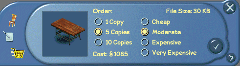 Creating an Object Step #1 While the process of creating an object is more difficult than a custom picture, there are many great tutorials available on the internet that are easy to follow. Take a look at the custom content introduction for links to some. After you have completed your custom object, an IFF file will have been created. Step #2 Copy the object IFF file from your The Sims 1.0 folder, which is usually located at C:\Program Files\Maxis\The Sims\Downloads\Transmogrified\ over to the custom content folder EA has created. From your desktop click on "My Documents" then "EA Games" then "EA-Land" and finally "Uploads". Inside this folder you will need to make another folder named "Chairs", "Tables", or "Sculptures" depending on which type of object you are uploading. Once you have created the folder copy any of the object IFF files you want to upload to it. ![]() Path to the Chairs Folder Step #3 Locate an open Services lot where you can make use of a Thumbhammer Workbench. Clicking on the workbench will give you the option to "Custom Build" the type of object you want to create. ![]() Custom Build on the Thumbhammer Workbench Step #4 You will be presented with a panel at the bottom of your screen that allows you to select one of the objects you copied to your custom content folder, and see a preview of how the object looks in game. Select the object you want to upload and click the middle button on the left side of the panel to describe your custom object. ![]() Selecting an Object Step #5 Enter a title and description for your object. This will be seen when someone views the object in their inventory or uses the custom content viewer interaction. After you have entered both pieces of information click the last button on the left side of the panel to complete your custom content order. ![]() Entering the Details Step #6 Select the number of copies you want to make of your object (1, 5 or 10), and if you are uploading a dining chair choose the comfort level by selecting either Cheap, Moderate, Expensive, or Very Expensive. The higher the comfort level of your dining chair, the greater the cost will be. If you approve of the cost click on the "Place Order!" button. ![]() Ordering a Chair You will recieve a confirmation dialog that the upload was successful and the object will be placed in your inventory. The object will initially appear as one of the proxy (placeholder) objects until it has been approved by an EA staff member. You will recieve an in-game mail message once it has been approved/disapproved.